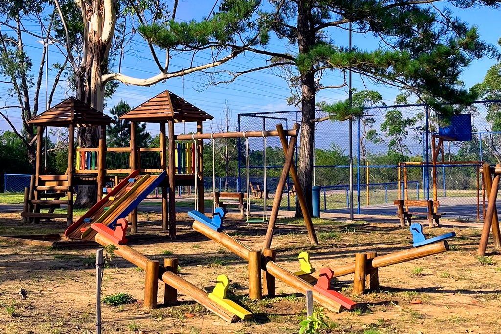 Praça com playground, quadra esportiva, equipamentos de ginástica e espaço pet.